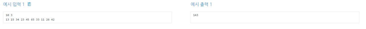 - 첫 줄에 자연수 N(3<=N<=100)과 K(1<=K<=50) 입력되고, 그 다음 줄에 N개의 카드값이 입력된다.