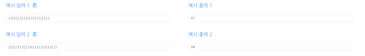 - 한 줄에 쇠막대기와 레이저의 배치를 나타내는 괄호 표현이 공백없이 주어진다. 괄호 문자의 개수는 최대 100,000이다.