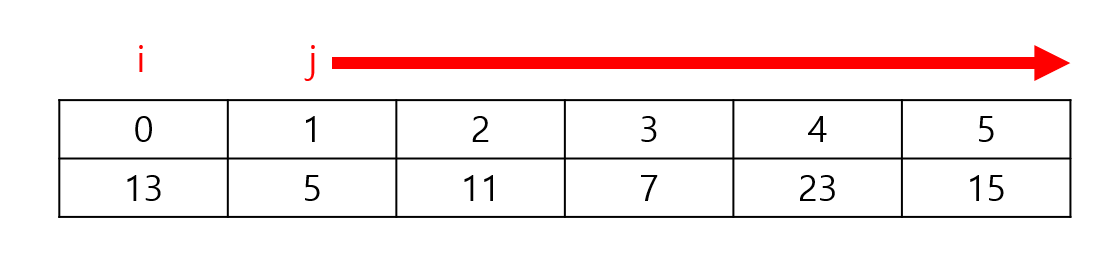 즉, 13과 5,11,7,23,15를 비교해서 가장 작은 값인 5를 맨 앞으로 놓는 것을 말한다.