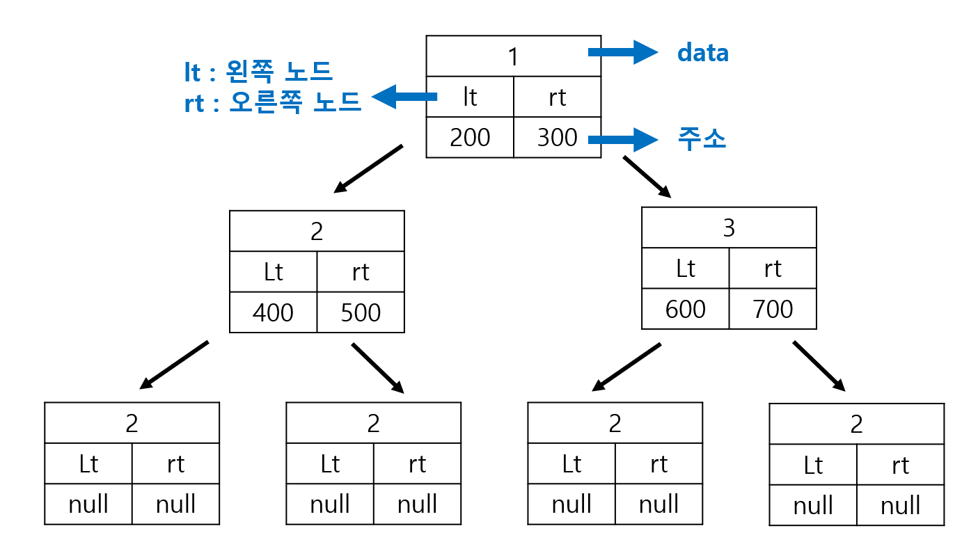 - 말단 노드는 자식이 없으므로 lt, rt 주소가 null 이다.
