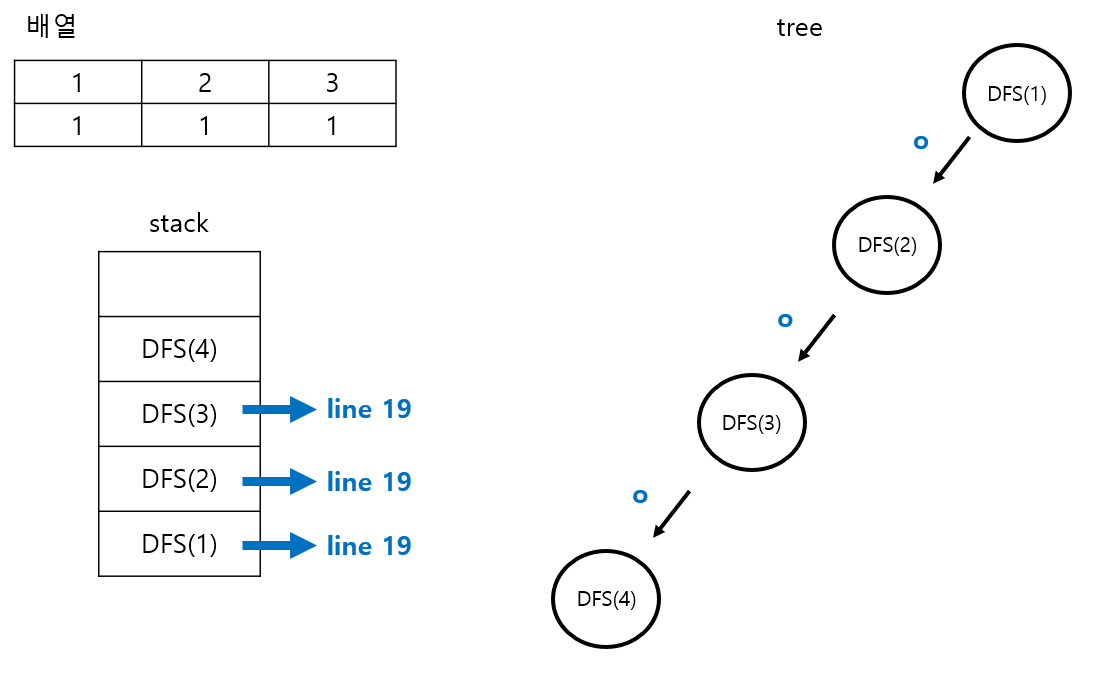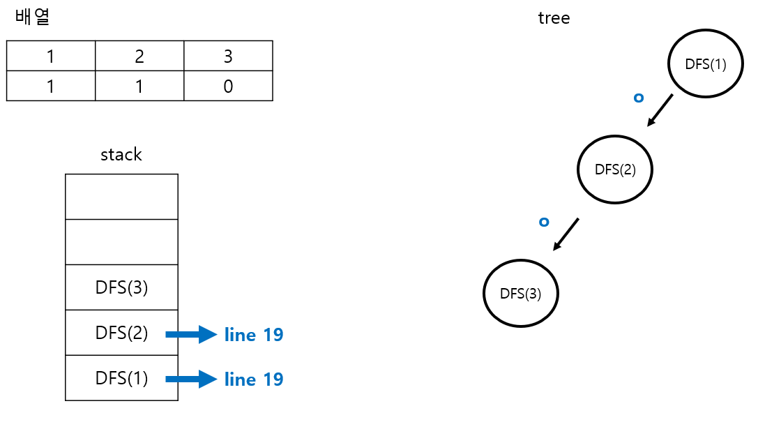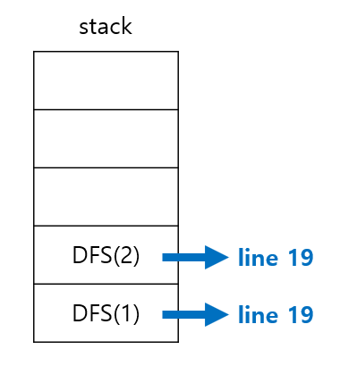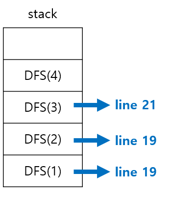 - DFS(3)의 복귀주소인 21 라인이 저장되고, DFS(4)는 쌓인 후에 pop() 된다.