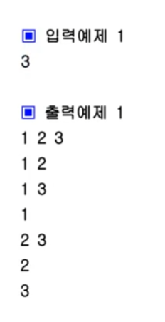 - 자연수 N이 주어지면 1부터 N까지의 원소를 갖는 집합의 부분집합을 모두 출력하는 프로그램을 작성하세요.