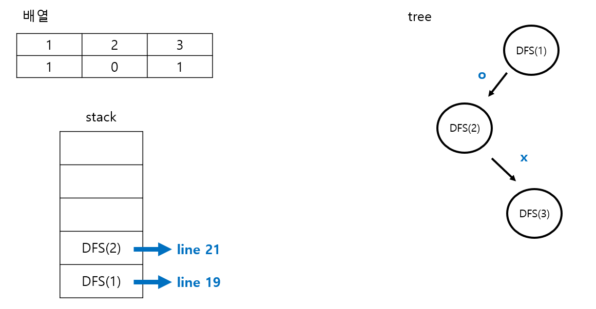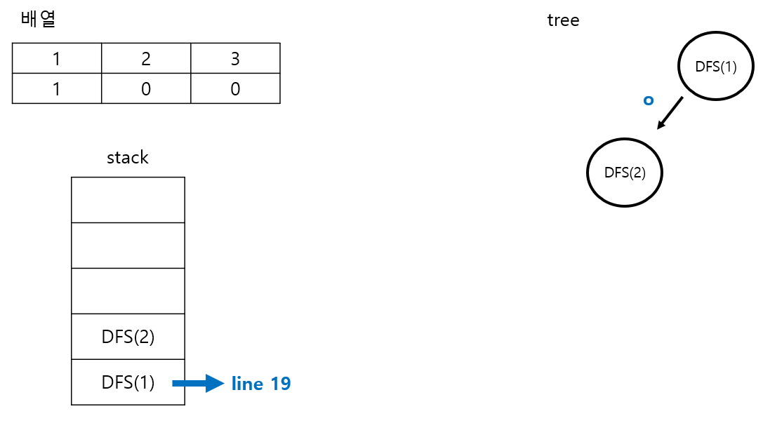 3. DFS(L+1) 코드를 통해 DFS(2)가 만들어지고, 트리와 스택은 다음과 같다.