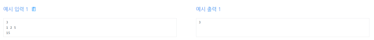 - 첫 번째 줄에는 동전의 종류개수 N(1<=N<=12)이 주어진다. 두 번째 줄에는 N개의 동전의 종류가 주어지고,