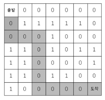 - 출발점은 격자의 (1, 1) 좌표이고, 탈출 도착점은 (7, 7)좌표이다. 격자판의 1은 벽이고, 0은 통로이다.