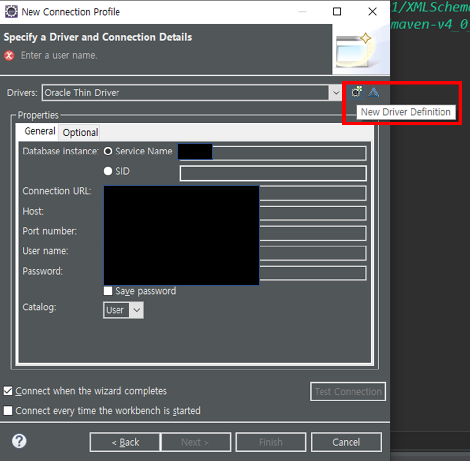 3) New Driver Definition 을 클릭하고 Name/Type 에서 자신에게 맞는 버전을 선택한다.