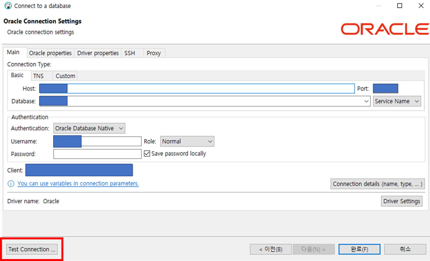 3) 파란 박스로 칠한 부분들을 입력하고 Test Connection 을 눌러서 Success! 가 뜨는지 확인한다.