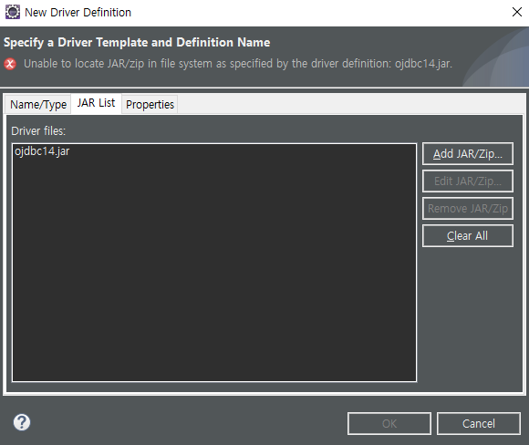 4) JAR List 탭으로 넘어가서 버전에 맞는 ojdbc.jar 파일을 찾아 넣어준다.