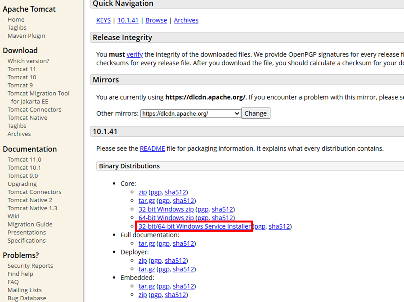 Tomcat 10을 클릭하고, 설치 파일인 32-bit/64-bit Windows Service Installer 을 선택해서 다운받아주세요.