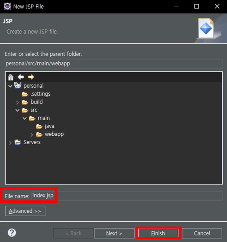 File name에 원하는 파일명을 입력하고 Finish 버튼을 누릅니다.