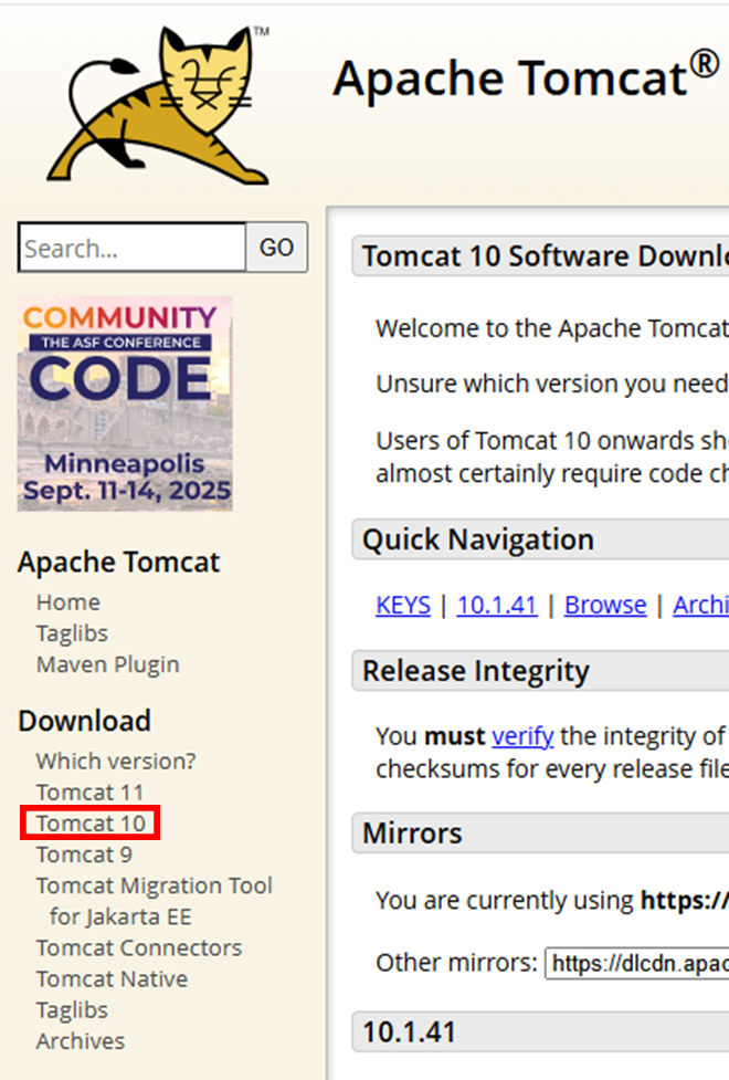저는 Java 17 버전을 쓸 것이기에, 그에 맞게 Tomcat도 10 버전으로 다운받습니다.