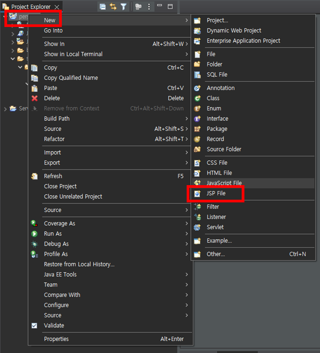 왼쪽 상단의 프로젝트에서 마우스 우클릭 > New > JSP File 을 순서대로 클릭합니다.