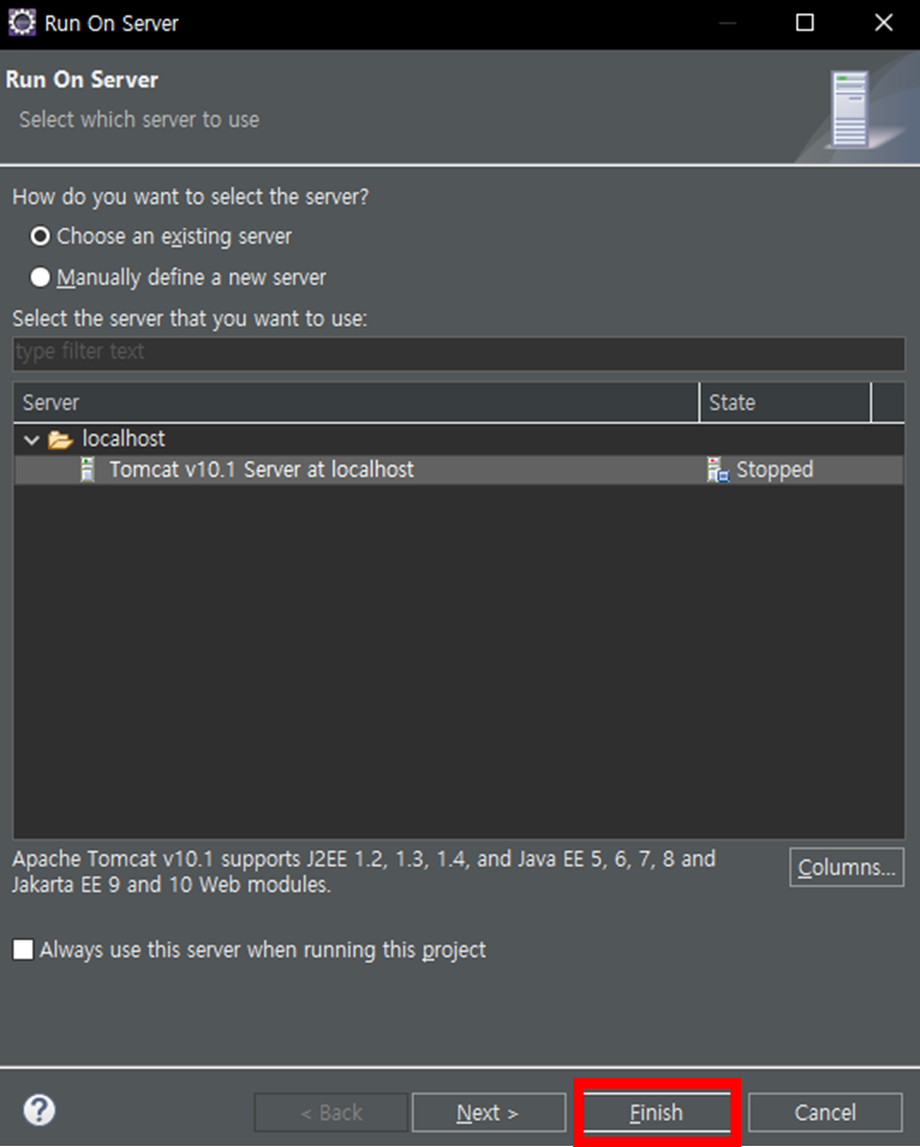 * Java 17 부터는 jakarta.* 패키지를 사용하기 때문에 호환성에 맞게 Tomcat도 jakarta.* 패키지를 사용하는 10 버전으로 사용합니다.