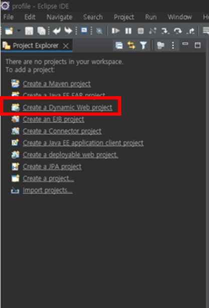 왼쪽에 있는 Create a New Dynamic Web Project 를 클릭합니다.