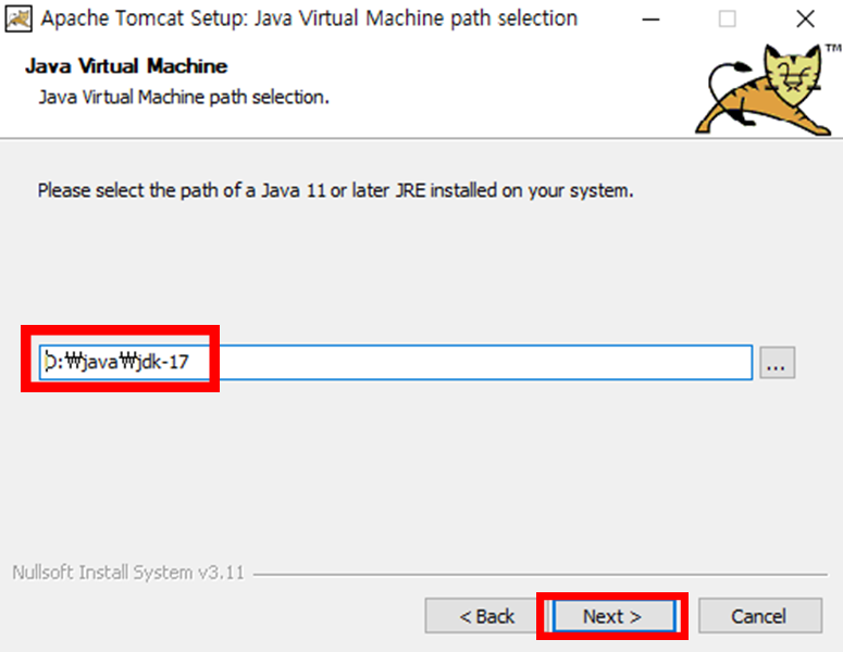 다음으로는 jdk가 설치된 위치를 확인합니다. 설치 과정에서 Tomcat이 자동으로 찾아서 잡아주기에 크게 신경쓰지 않아도 됩니다.