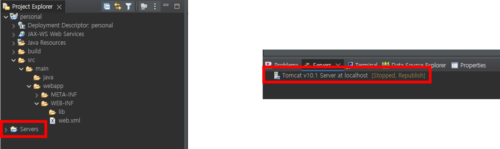 그러면 이클립스의 왼쪽과 아래쪽에 아래와 같이 서버가 뜬 것을 볼 수 있습니다.