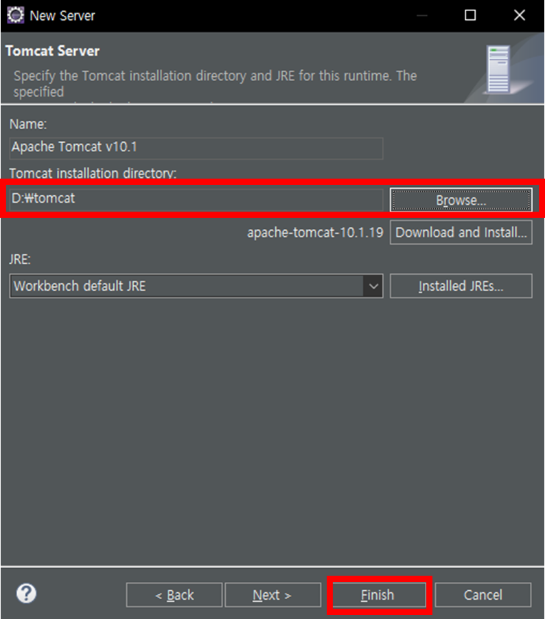오른쪽의 Browse 버튼을 눌러서 설치한 톰캣의 위치를 잡아주세요.