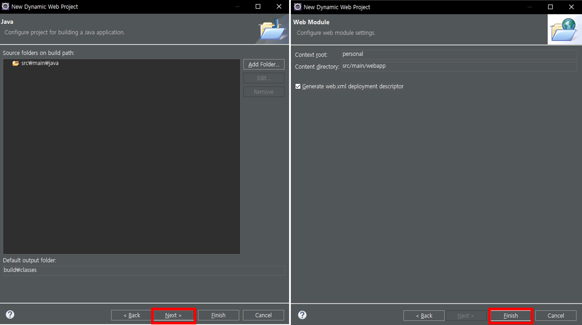프로젝트 구조와 경로 등을 확인한 후에 Finish 버튼을 눌러주세요.