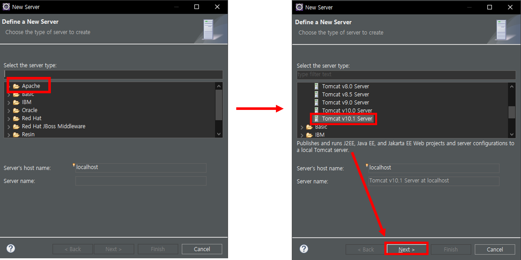 맨 위에 있는 Apache 폴더를 선택하고, 설치한 Tomcat 버전에 맞는 서버를 선택해서 Next 버튼을 누릅니다.