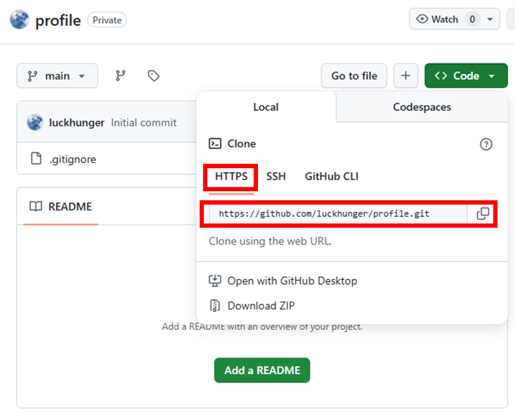 <> Code 버튼을 누르고, HTTPS 를 눌러서 나온 주소를 복사해주세요.
