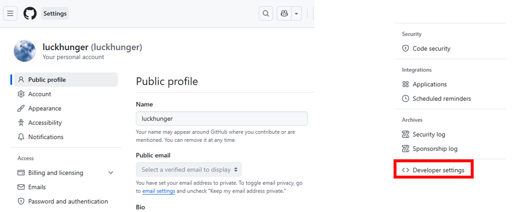 Settings 에 들어왔으면, 아래로 쭉 내려서 왼쪽에 Developer settings 를 클릭합니다.