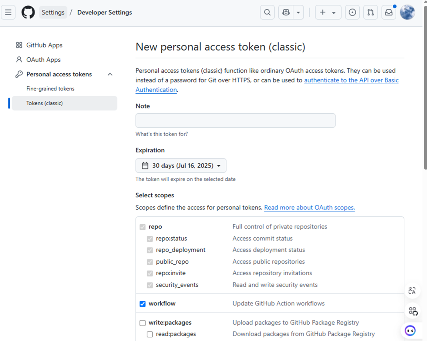 Select Scopes 는 repo와 workflow 정도만 체크할게요.
