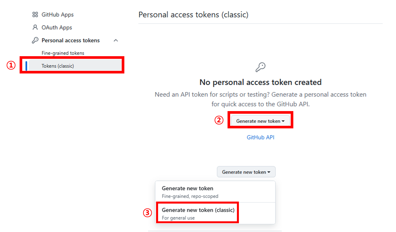 화면의 가운데에 Generate new token 을 클릭하고 Generate new token (classic) 을 선택합니다.
