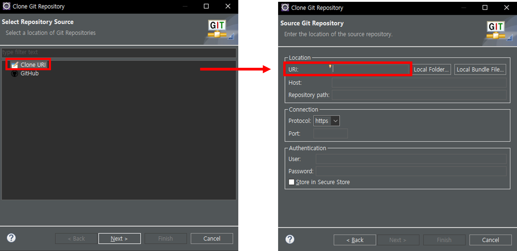 Clone URI 을 누르면 나오는 창에서 URI 에 복사한 주소를 입력합니다.