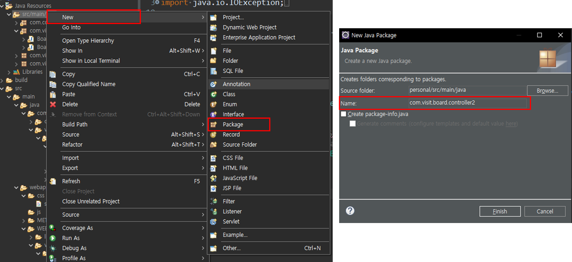 상단의 Java Resources > src/main/java 에서 마우스 우클릭 > New > Package 를 눌러줍니다.