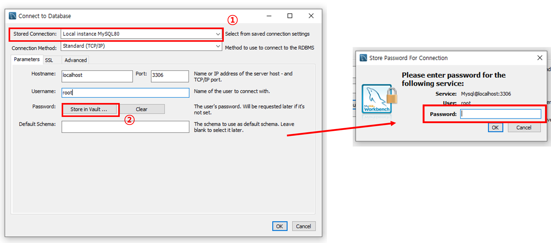 Stored Connection 을 선택하고, Password의 Store in Vault 버튼을 눌러줍니다.