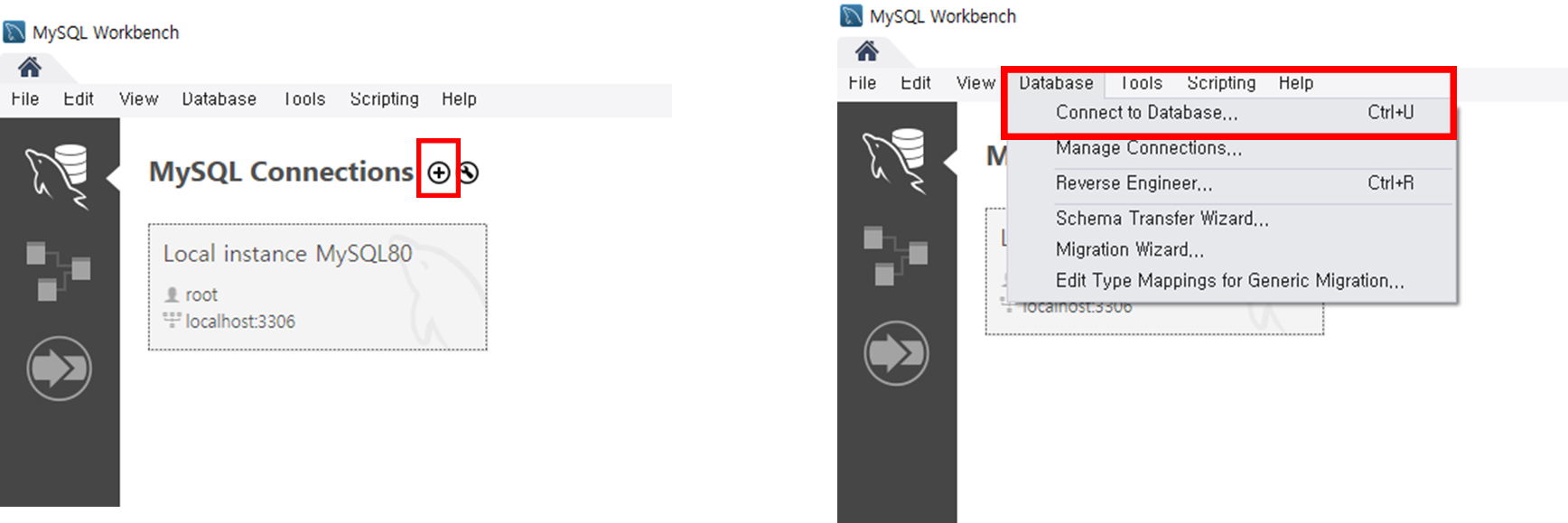 + 버튼 혹은 Database > Connect to Database 를 눌러서 DB 연결 화면으로 넘어갑니다.