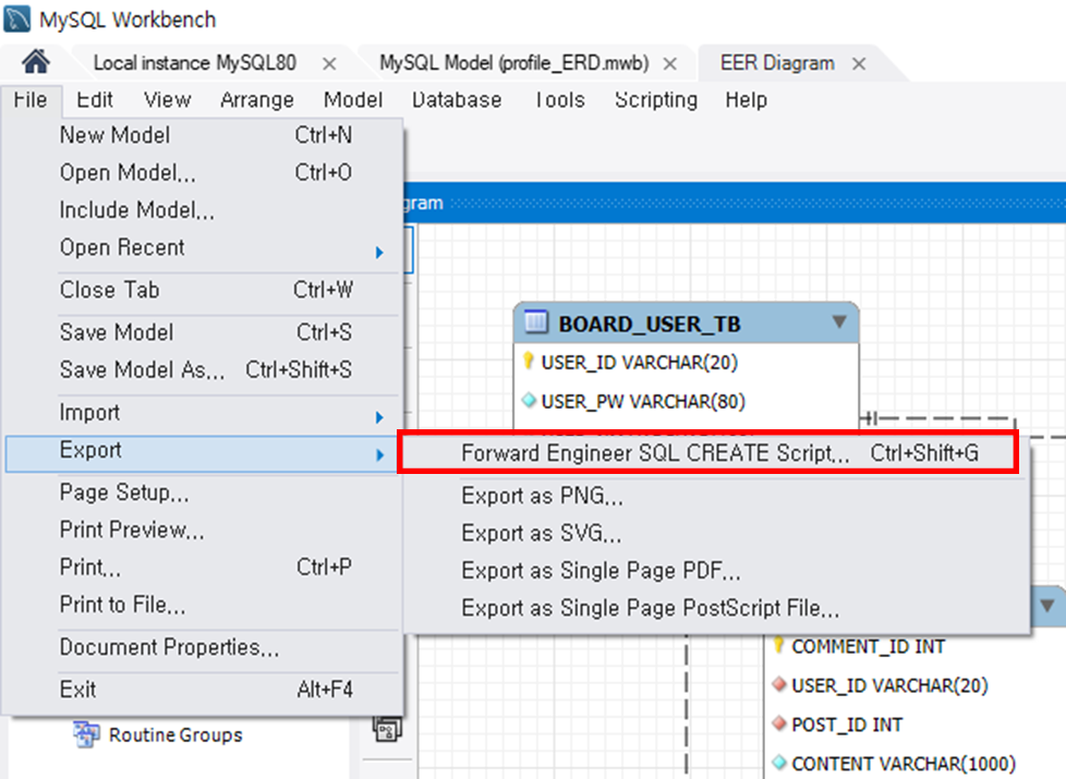 상단의 메뉴에서 File > Export > Forward Engineer SQL CREATE Script 을 클릭합니다.