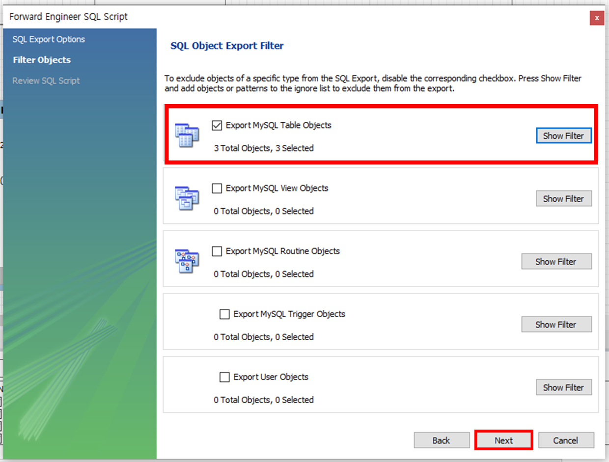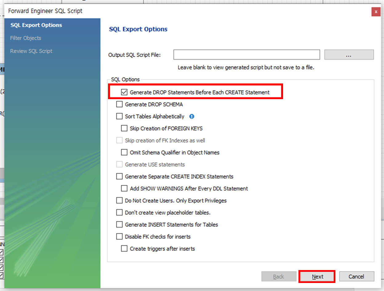 신경 쓸 옵션은 가장 위에 있는 Generate DROP Statements Before Each CREATE Statement 입니다.