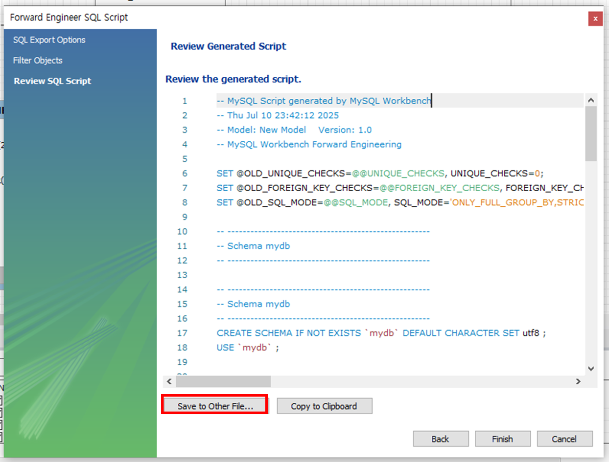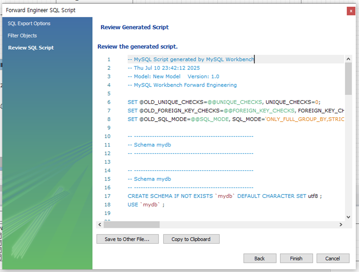 Finish 를 누르고 나와서, MySQL Workbench Query 창에 붙여넣은 후(Ctrl + V) 실행하겠습니다.