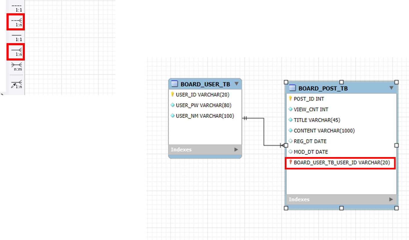 여기서 주의할 점은, 1:n 이라고 적힌 아이콘이 두 가지가 있다는 것을 볼 수 있습니다.