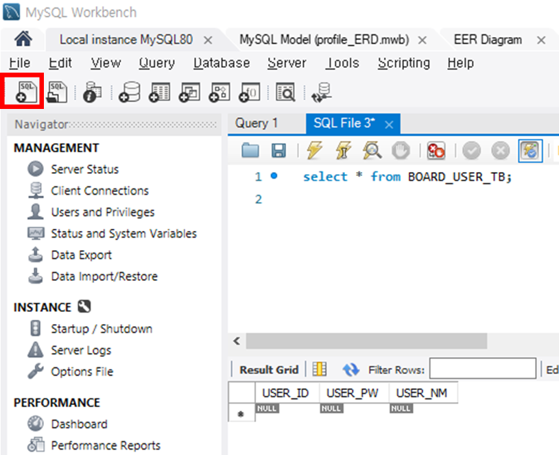 아래 아이콘을 클릭해서 SQL 창을 추가로 열어줍니다.