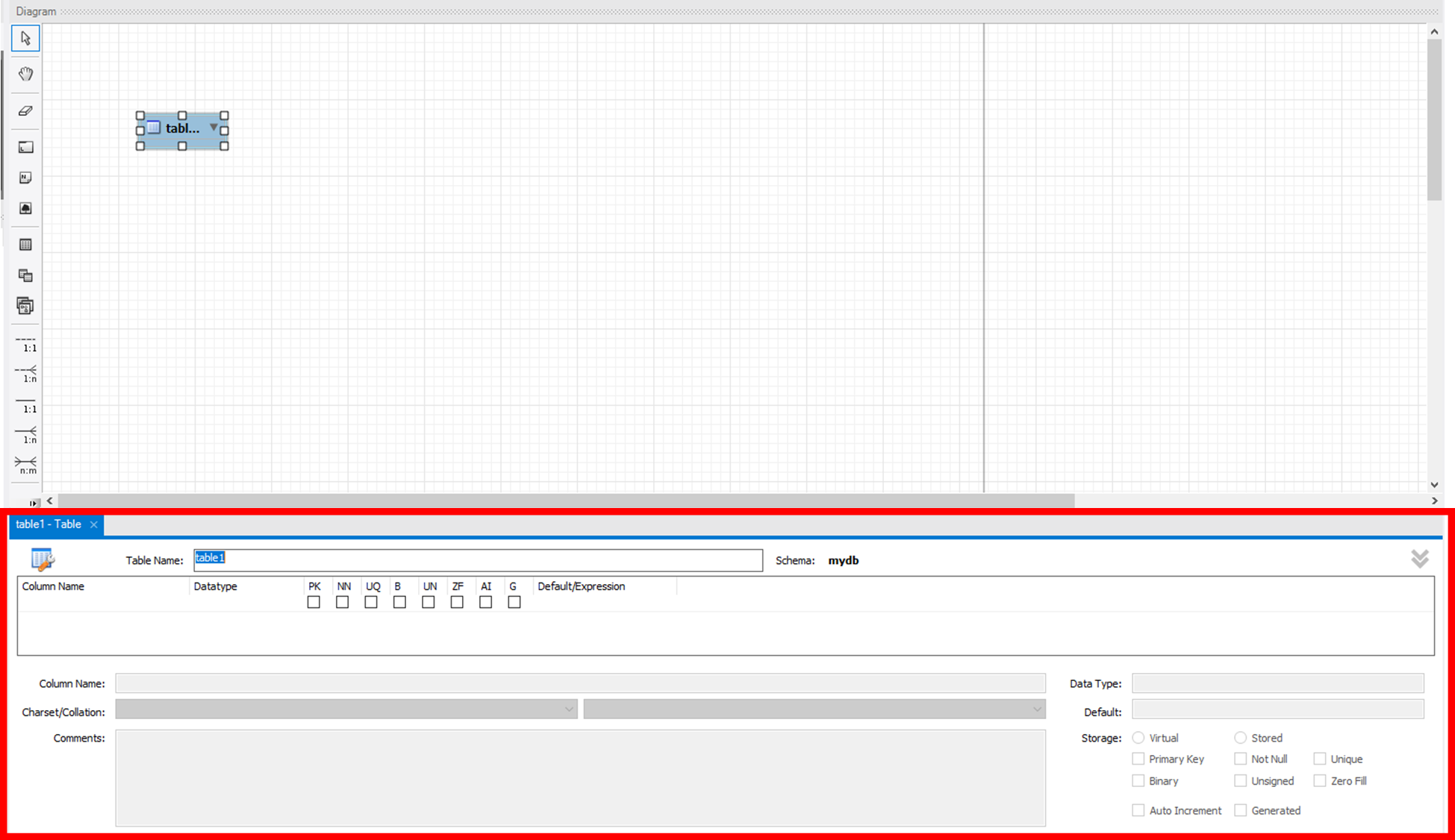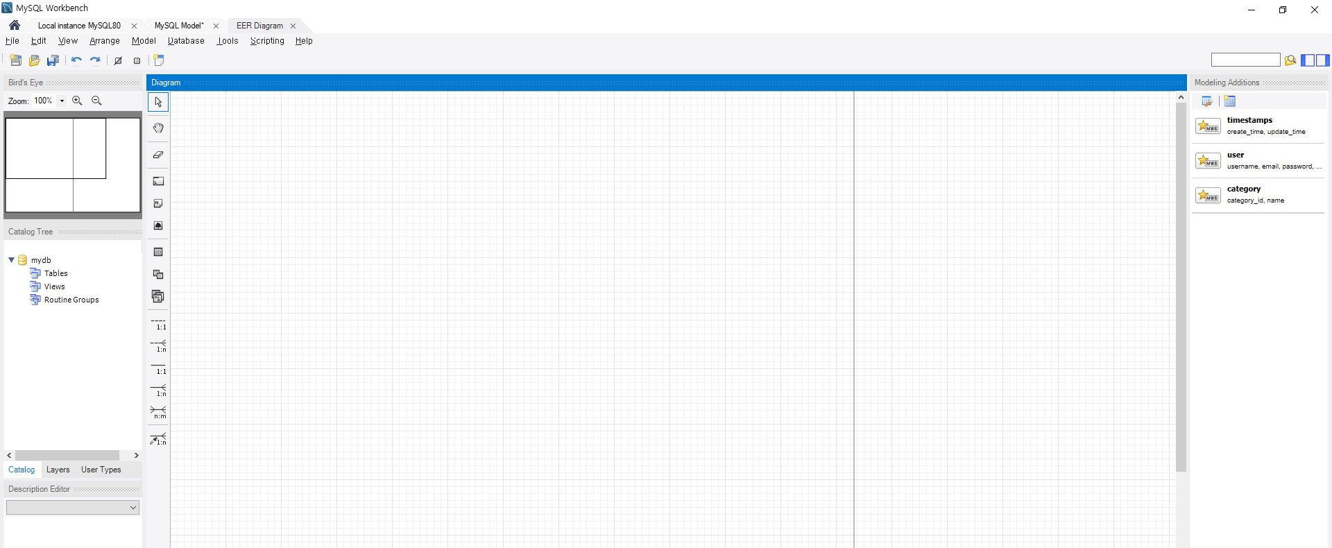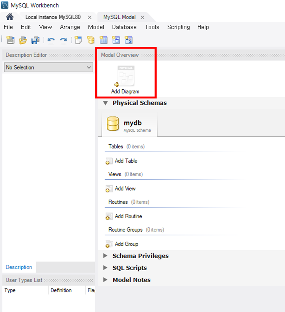 새 모델이 생성되면 MySQL Model 이라는 창이 열립니다.