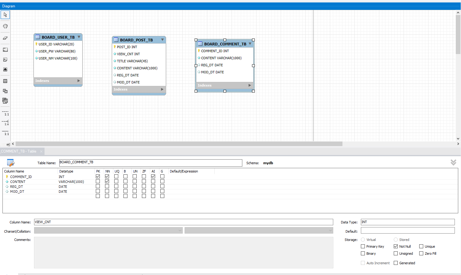 게시글 테이블 (BOARD_POST_TB)에서 댓글 테이블(BOARD_COMMENT_TB)로 비식별 1:N 관계를 설정합니다.