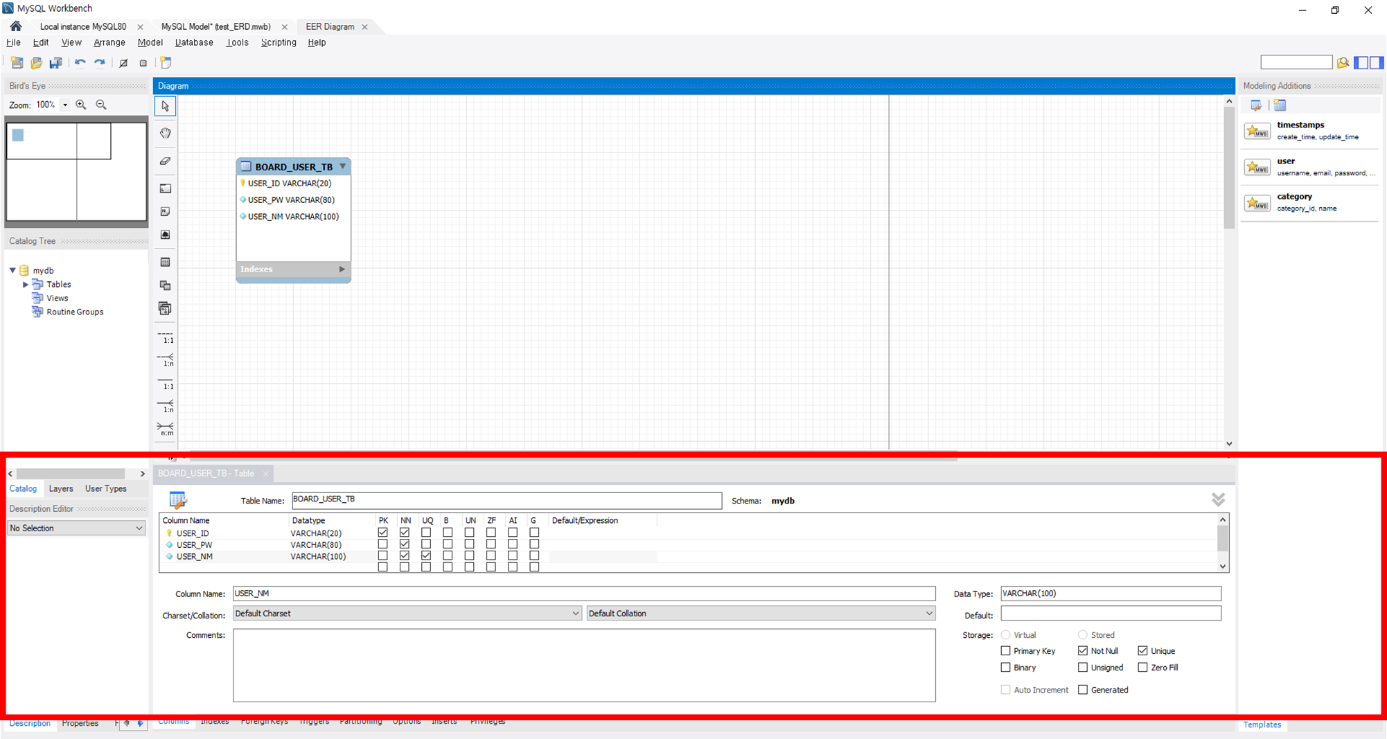 만들어진 테이블을 더블클릭하면 하단에 테이블 이름과 컬럼을 정의할 수 있는 입력창이 열립니다.