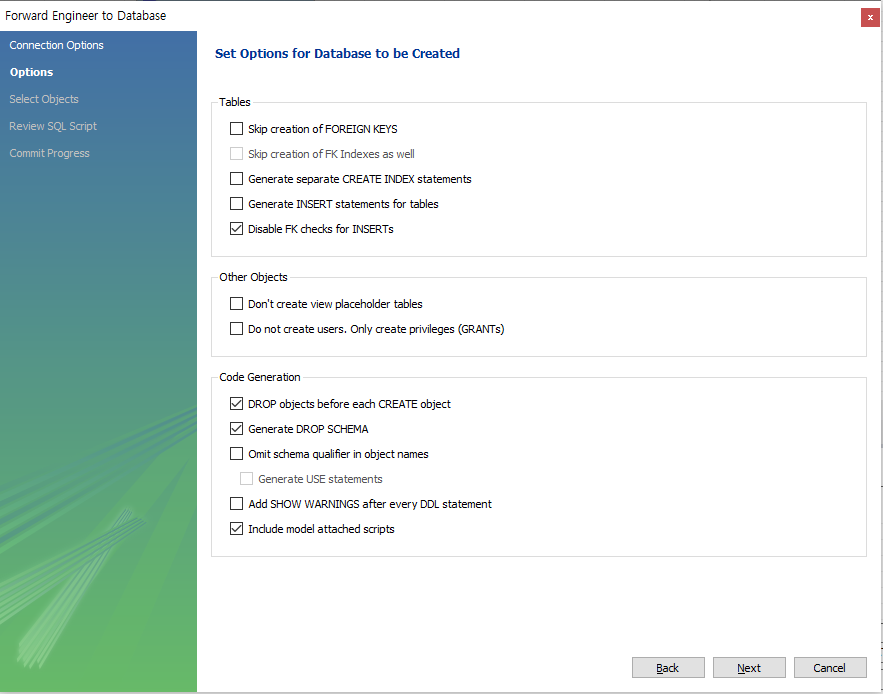 쿼리 추출 방식에 대한 자세한 설명은 다른 글에서 다뤘으므로, 여기서는 워크벤치의 Forward Engineer 시 체크할 주요 옵션만 간단히 정리하겠습니다.