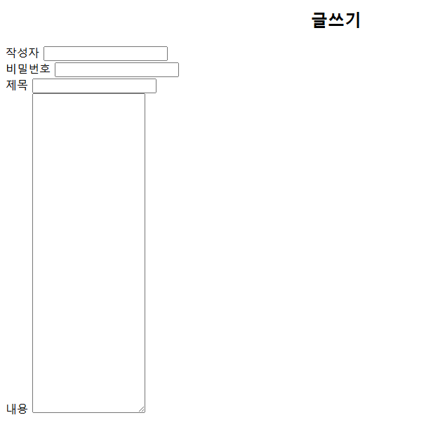 따라서 글쓰기 화면에서는 작성자, 비밀번호, 제목, 내용 네 가지를 입력하는 칸만 구성할 것입니다.