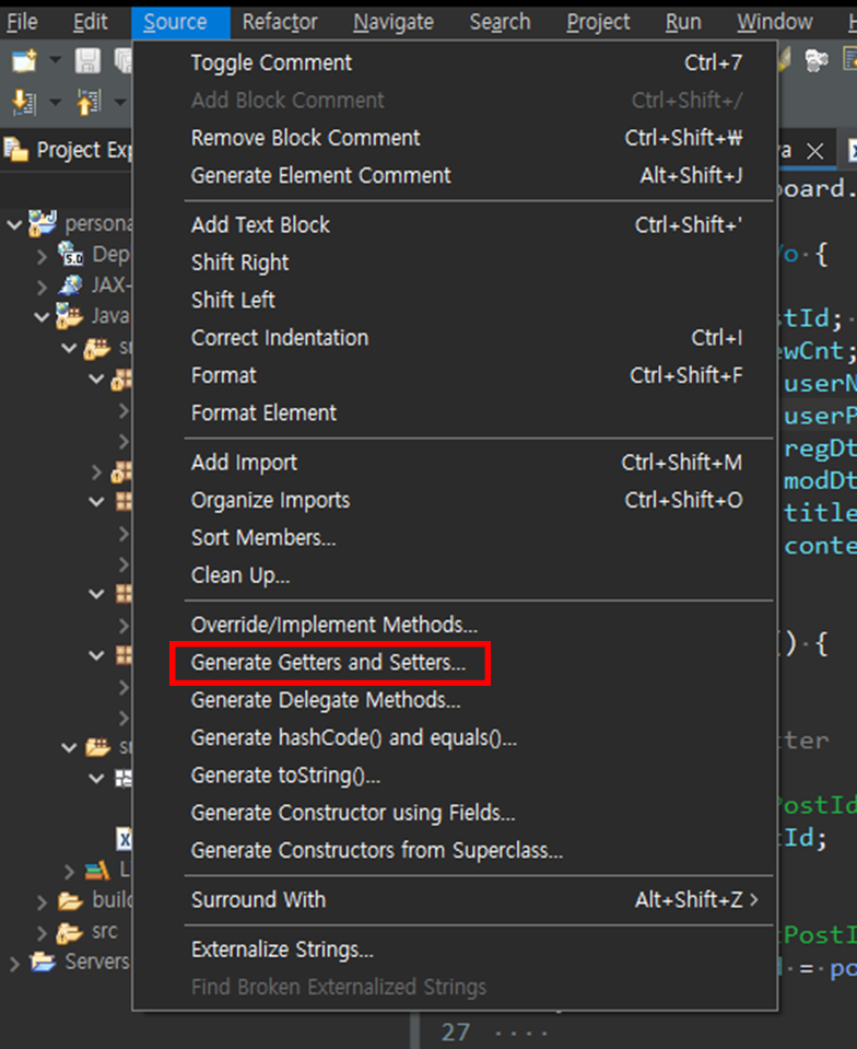 BoardVo.java 파일을 연 상태에서 Source > Generate Getters and Setters... 를 선택합니다.