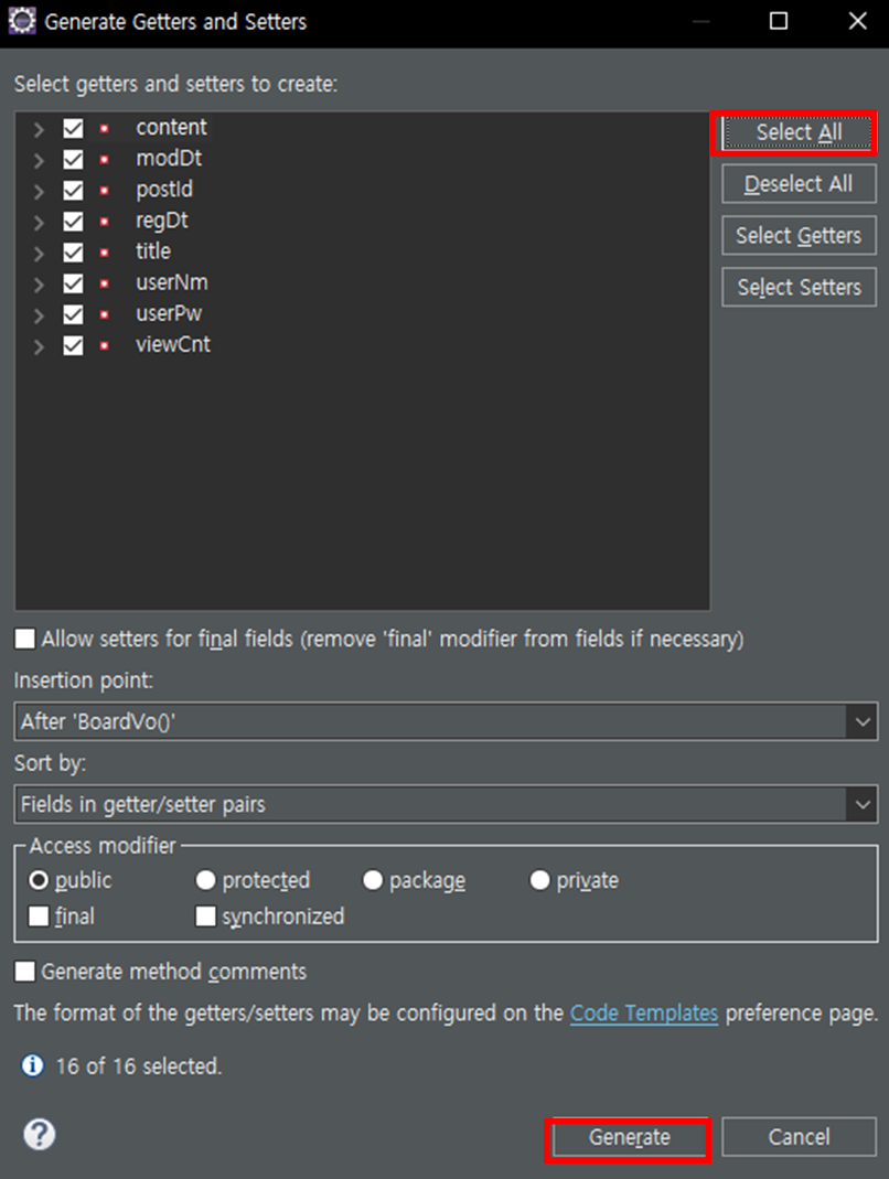 만들지 않은 getter, setter 항목들이 표시되는데, Select All을 눌러 전부 체크해주고 Generate를 눌러 생성합니다.