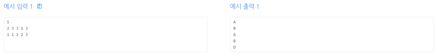 - A, B 두 사람이 가위바위보 게임을 합니다. 총 N번의 게임을 하여 A가 이기면 A를 출력하고, B가 이기면 B를 출력합니다. 비길 경우에는 D를 출력합니다.