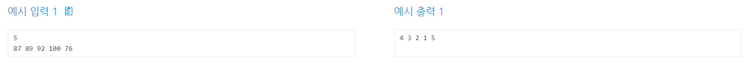- N명의 학생의 국어점수가 입력되면 각 학생의 등수를 입력된 순서대로 출력하는 프로그램을 작성하세요.