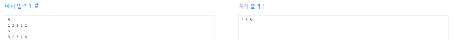 - 두 집합의 공통원소를 오름차순 정렬하여 출력합니다.