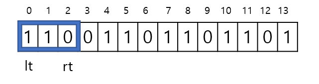 - 위 과정이 반복되다가 lt가 2일때 arr[lt] 값이 0이므로 cnt는 1이 되고, lt는 1 증가해서 3이 된다.